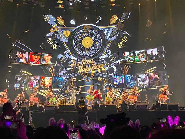 当巨型球体打开后,染着一头红发的周董也缓缓现身,他后方的霓虹翅膀也随之展翼,伴随着《半兽人》、《本草纲目》等经典歌曲,在开场就营造视觉及听觉的震撼,让现场1.1万名歌迷全都嗨翻;舞台上演出人员总计高达40人,加上舞台视觉和硬体搭设、动画制作、精品级的道具及服装,让整场演唱会再度刷新周杰伦演唱会成本纪录。