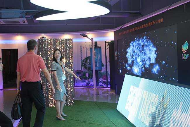 轻薄新颖、操作简单的镜子屏面前,正显示着LCF产品的应用领域与案例赏析,高清的动态图文,带给了张晓新教授一行新奇的视觉体验。