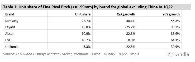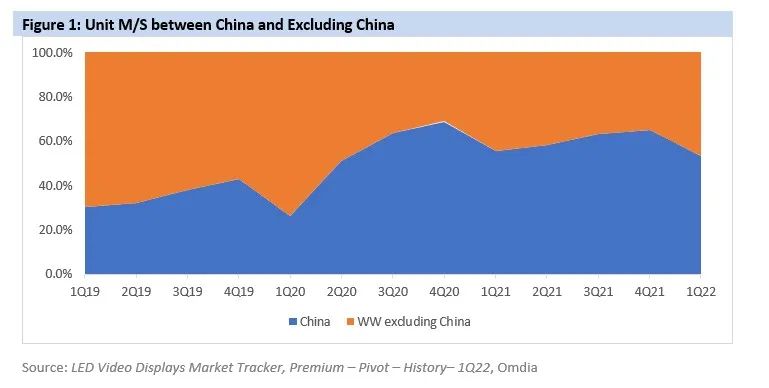 由于季节性低谷和疫情防控限制,LED显示屏中国的市场份额从上一季度的64.8%下降至2022年第一季度的53.2%。
