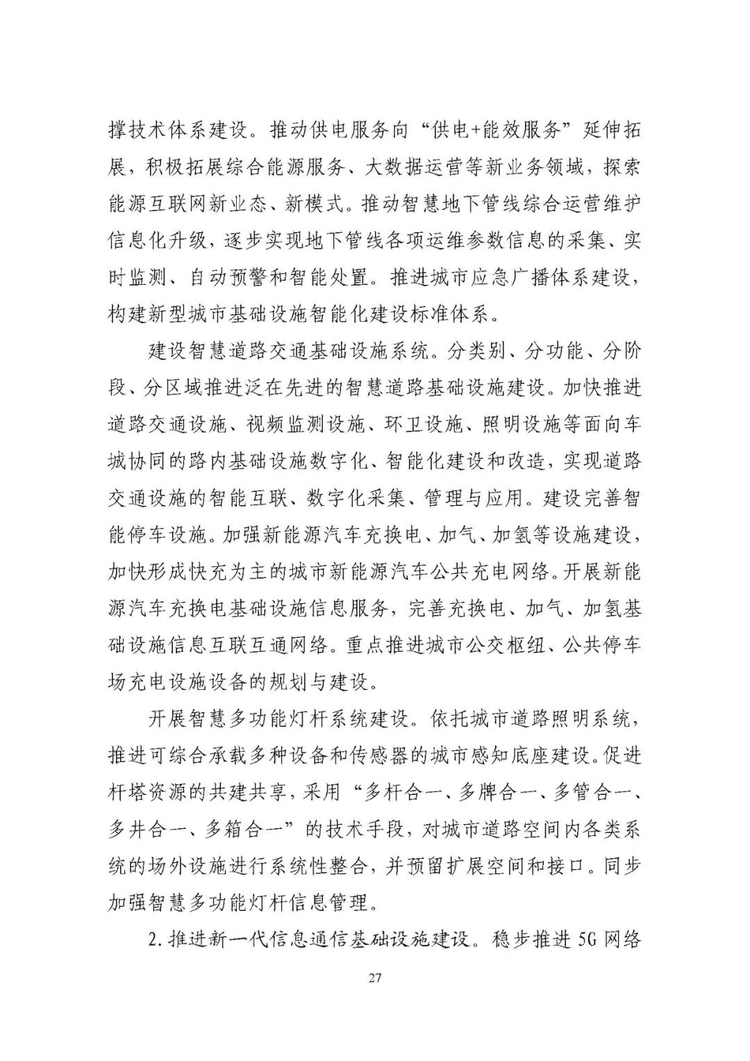 《规划》提出包括城市基础设施智能化建设行动在内的多项重大行动。其中提出开展智慧多功能灯杆系统建设,促进杆塔资源的共建共享,采用“多杆合一、多牌合一、多管合一、多井合一、多箱合一”的技术手段,对城市道路空间内各类系统的场外设施进行系统性整合,并预留扩展空间和接口。同步加强多功能智慧灯杆信息管理,预计建设智慧多功能灯杆13万根以上。