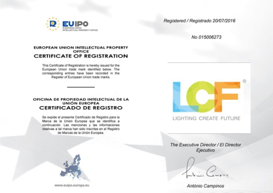 2016.11.09,ROYAL皇家88“LCF”商标通过了欧盟商标委会员的审核,正式通过申请并核发了商标注册证书,“LCF”通过了第9类、第11类、第35类的商标注册,标志着“LCF”向国际知名品牌的目标又有了一个历名性的飞跃,为“LCF”品牌在欧洲市场起到了更为全面的保护。