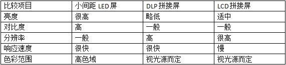 LED小间距显示屏,和LCD、DLP拼接屏,是室内平板显示领域的三大王者,各有优劣,参见下表: