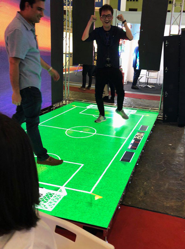 此次ROYAL皇家88在展区设计和展品布局上,特别注重突出产品的特点和优势。被互动地砖屏吸引的国际友人,在踢球游戏结束后,意犹未尽。